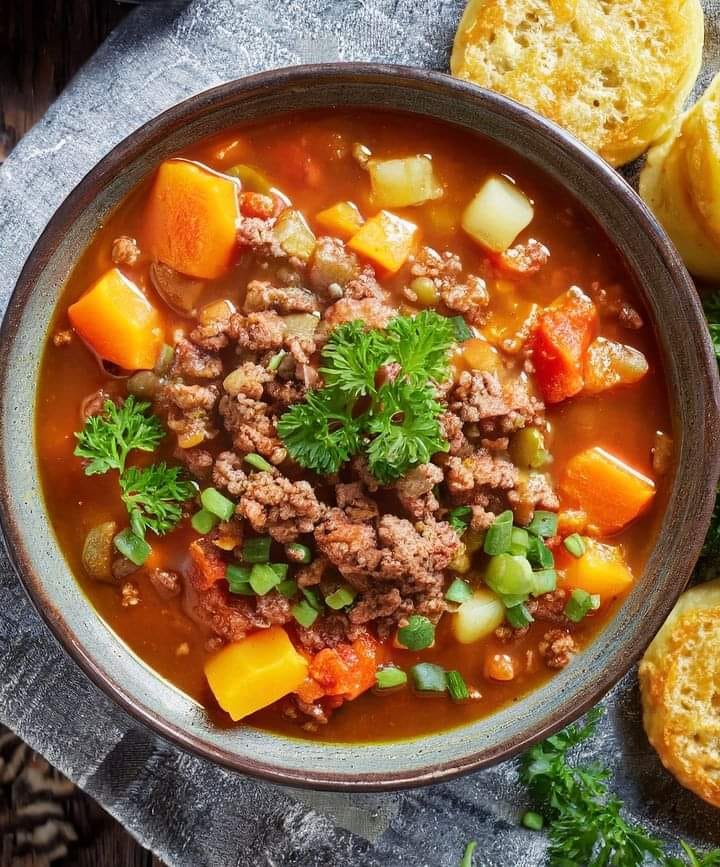 This robust and comforting soup is a culinary embrace of wholesome flavors, featuring a medley of ingredients that come together in a symphony of taste and texture. At its core is the humble yet versatile hamburger, transformed into savory perfection as it mingles with an array of vegetables and aromatic herbs. The soup’s foundation lies in a rich and flavorful broth, the result of simmering the ingredients to perfection. As you lift the spoon, the aroma of the bubbling concoction wafts through the air, promising warmth and satisfaction with every spoonful. The hamburger, crumbled into savory bites, infuses the broth with its meaty essence, creating a hearty base that anchors the entire dish. Amidst the broth, an array of vegetables adds a vibrant and nutritious dimension to the soup. Carrots, celery, and potatoes contribute their earthy sweetness, while tomatoes lend a hint of acidity that balances the richness of the meat. Each vegetable, tender and immersed in the broth, becomes a delectable treasure waiting to be discovered. The harmony of flavors is further enhanced by a blend of aromatic herbs and spices. Garlic and onions sautéed to golden perfection add depth, while a sprinkle of thyme and bay leaves introduces a subtle herbaceous note. The resulting amalgamation is a tantalizing medley that captivates the senses and invites you to savor each nuanced spoonful. This Hamburger Soup transcends the ordinary, offering a comforting and fulfilling experience that transcends the sum of its parts. It’s a celebration of home-cooked goodness, a bowl of warmth that nourishes not only the body but also the soul. As you delve into each comforting spoonful, you’re transported to a place where simplicity meets culinary delight, reminding you that sometimes, the most satisfying meals are the ones that wrap you in a familiar, flavorful hug.