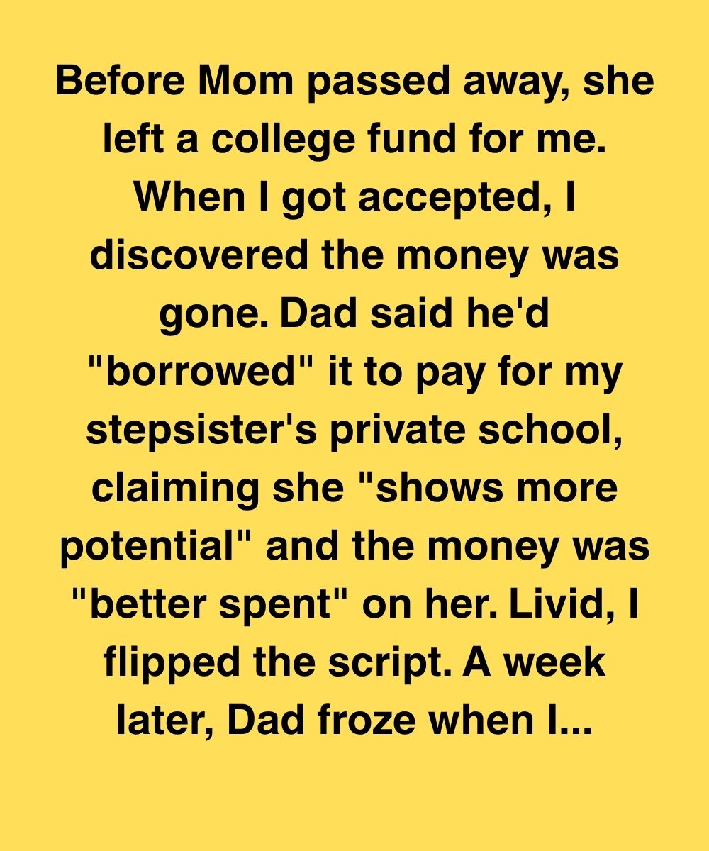 Before Mom passed away, she left a college fund for me. When I got accepted, I discovered the money was gone. Dad said he’d “borrowed” it to pay for my stepsister’s private school, claiming she “shows more potential” and the money was “better spent” on her. Livid, I flipped the script. A week later, Dad froze when I…