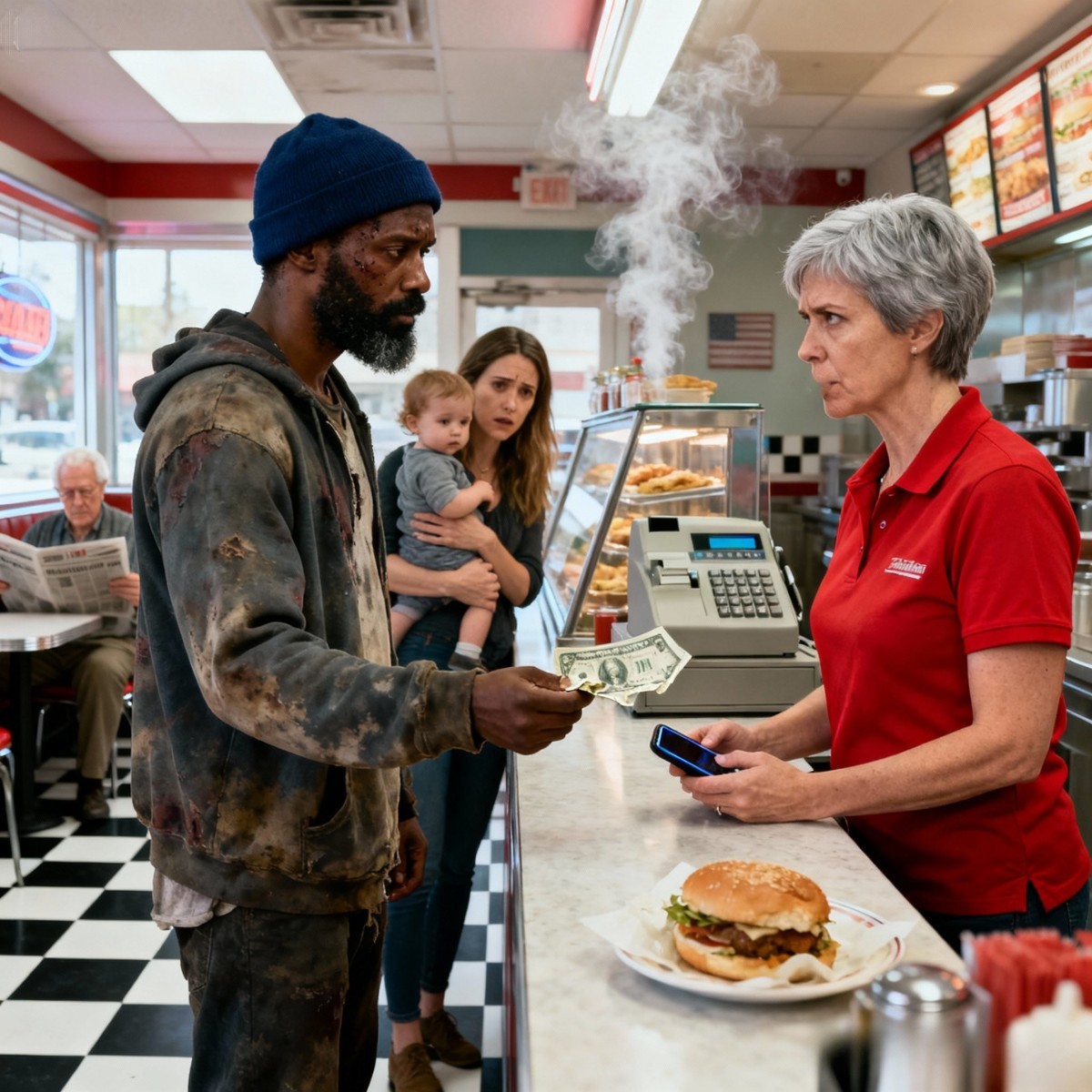 She glanced at the man, then at the dining room, clearly weighing a decision she shouldn’t have had to make.