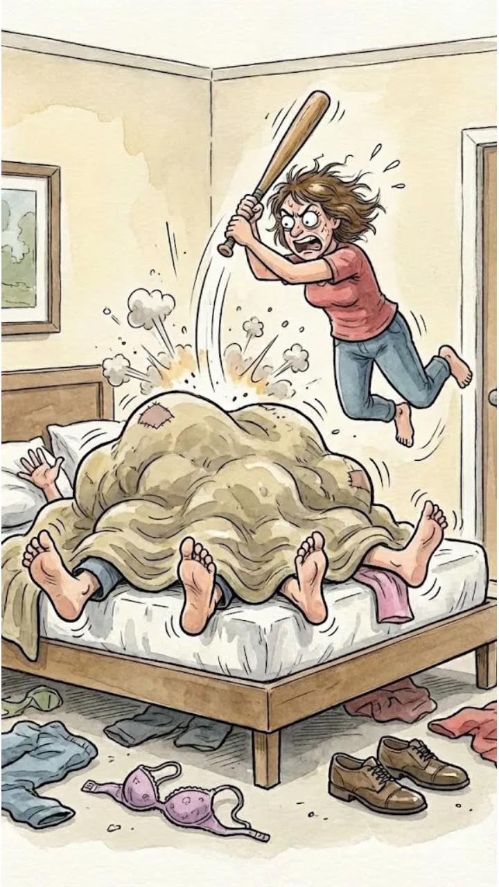 *“Wife comes home late at night and quietly opens the door to her bedroom. From under the blanket she notices four legs instead of two…”*